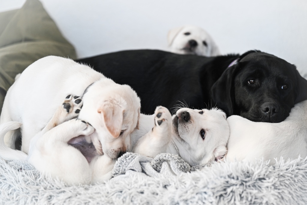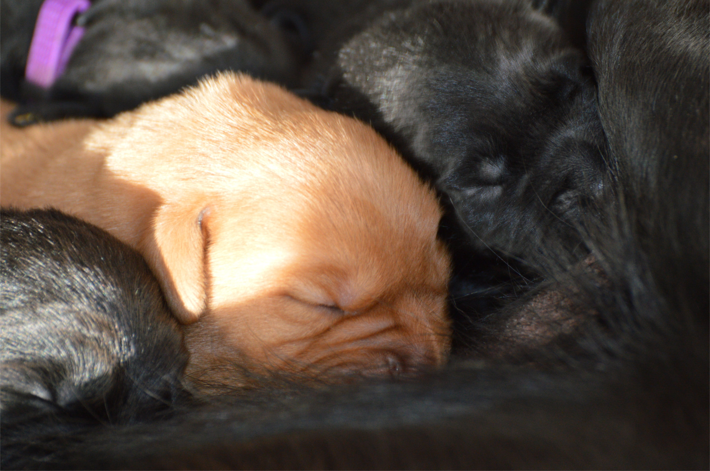 Wieder war es im Frühjahr 2022 soweit. Mary trug wieder ihren Nachwuchs im Bauch, diesmal verlief die Schwangerschaft wie im Bilderbuch, allerdings war der Bauch noch runder als im Jahr zuvor. In einer Bilderbuchgeburt brachte Mary dann 9 Welpen auf die Welt. Zwei Damen in den Farben, foxred, zwei Buben in schwarz und fünf Mädels in schwarz. Da war Leben in der Bude.
