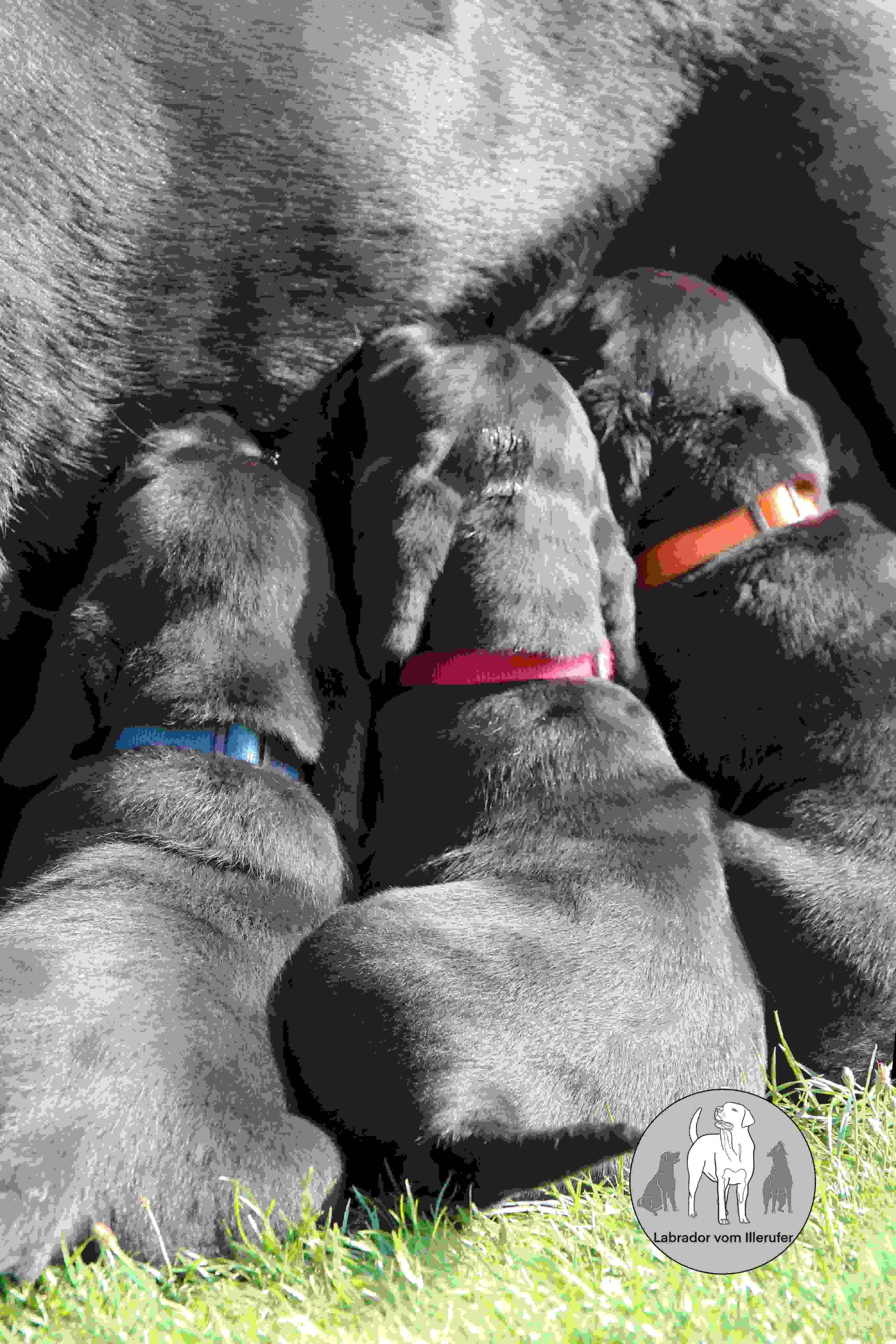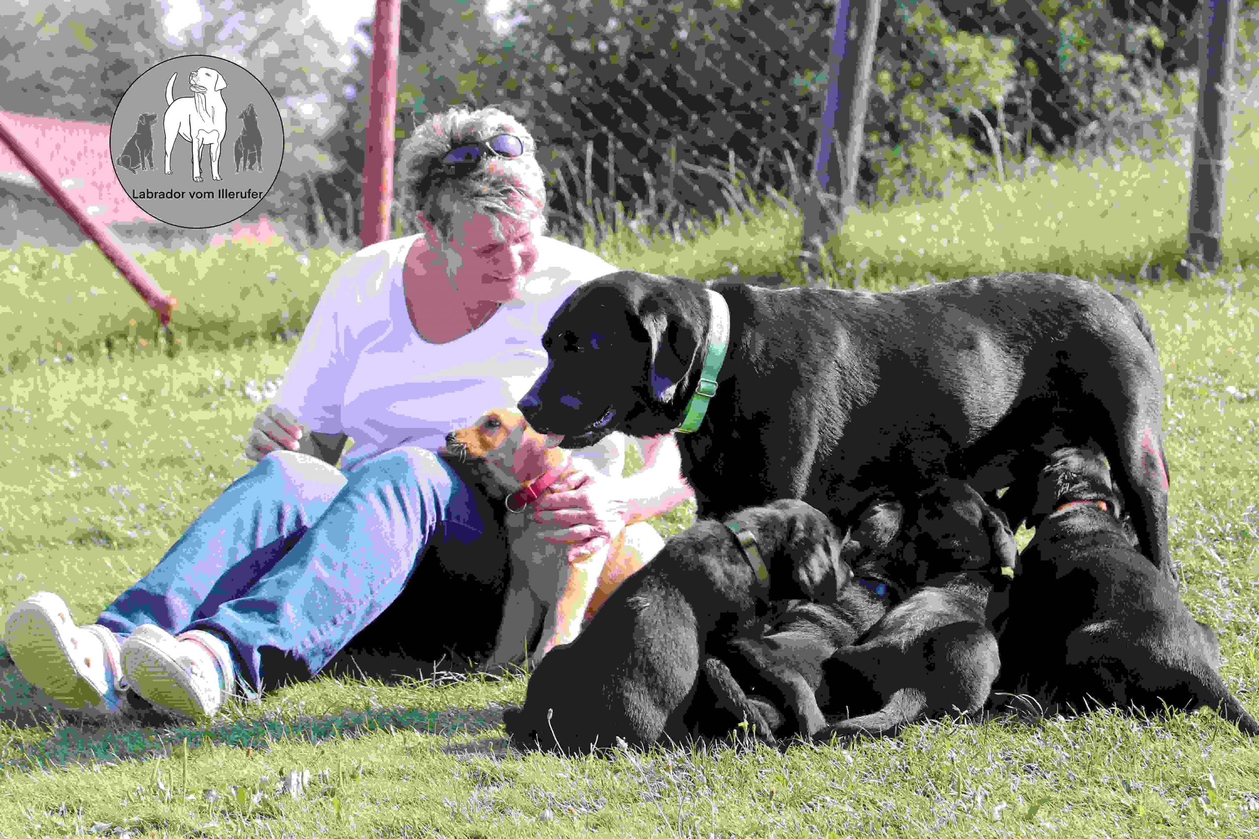 Im August 2016 brachte Bonnie ihren ersten Wurf mit 5 Welpen zur Welt. Eine gesunde Mischung aus drei Rüden und zwei Hündinnen brachten das Leben von Bonnie gehörig durcheinander. Ein Welpe war ein brauner Rüde, er war von Anfang an unser Sonnenschein. So tauften wir ihn „Anton vom Illerufer“. Die andern beiden Mädels waren „Anka“ und „Amelie“ vom Illerufer, die beiden anderen schwarzen Buben „Aaron vom Illerufer“ und „Apollo vom Illerufer“ . Alle Welpen haben tolle Familien gefunden und sind alle im Allgäu in der näheren Umgebung geblieben. Für Bonnie als erstgebährende Hündin ein solider Einstieg, denn schon bald nach der Abgabe war Bonnie wieder fleißig im Training und später im Einsatz als Rettungshündin.